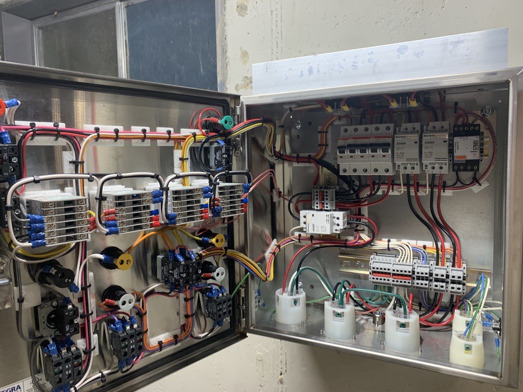 Its time to take this collection of stainless pots and fittings and turn it into a brewing machine! Spike has a well written set of instructions (you can view the instructions here). There are a lot 3 piece ball valves and quick connect fittings on the outside and on the inside are push to connect fittings for the dip tubes and HERMS coil. Each kettle has a temperature sensor that also needs to be installed with pipe tape. The only problem I had through the entire process was putting the dip tube into false bottom of the mash tun was challenging. Spike tells you to install the false bottom then slide the center pick up into its fitting then pull on it and twist into place this didn’t work that well on this size kettle so after some finagling, I eventually got it into place. Everything else was smooth sailing and I moved on to electrical next.