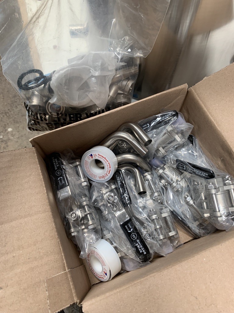 The Trio system showed up at Perfect Brewing Supply in five big boxes about a week after I ordered it. The first box I happened to open was the one that had all the three piece ball valves and quick connect fittings, there a lot of fittings!!!! The other boxes quickly followed and there is no wasted space every kettle was full of parts.