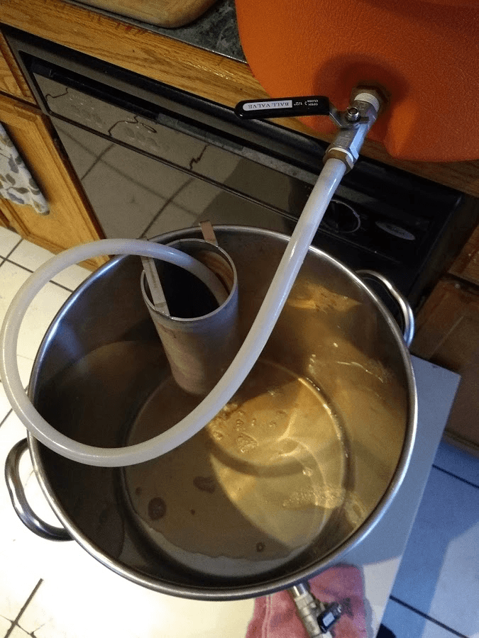 When brewing at home, I am very limited due to the small amount of open space in my apartment, and zero outdoor space to set up a propane burner. Therefore, my brewing set up is somewhat minimal. I use two pots, one to hold my strike water (which then acts as my boil kettle) and another for sparge water, and a 10 gallon cooler w/ false bottom as my mash tun. I have an 8 gallon pot and a 5 gallon pot, but because I am only able to get about 4.5 gallons up to a nice, rolling boil on my stove top, I do 3-3.5 gallon batches that I boil in the 5 gallon pot. I’ve been doing it this way for years and have my system very well dialed in and am quite happy with the beers I’m able to produce this way.