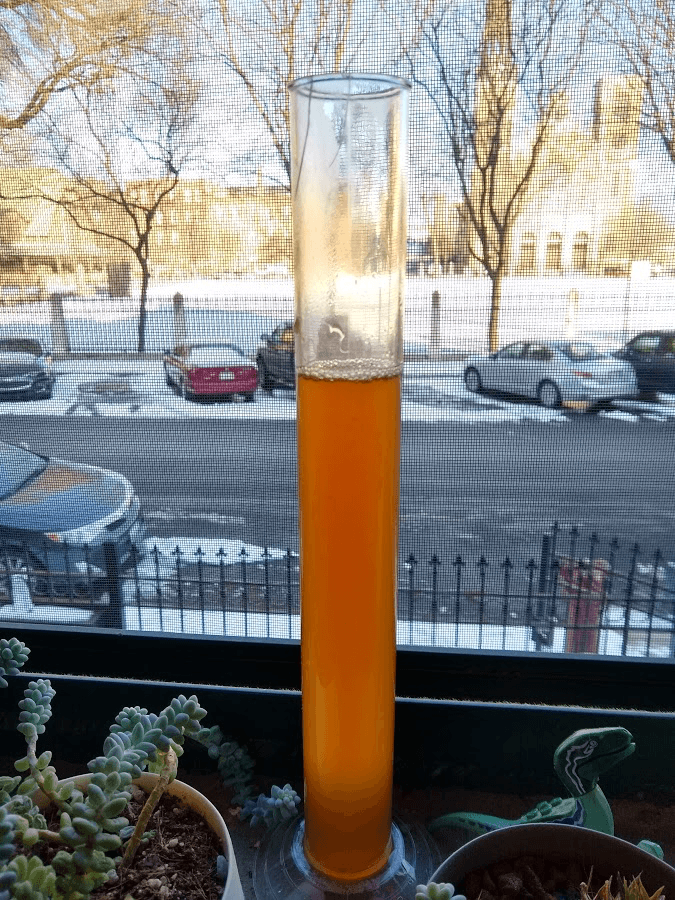 What I was doing was basically a “parti-gyle” brew, but instead of getting one big beer and one small beer, I decided to use the small beer to “top up” the boil on the big beer as it boiled and just go “all in” on the big beer. As the main beer boiled and concentrated, I continued to feed it more of the boiling second runnings to keep the volume up, but still continually concentrating the first runnings. After topping up and boiling off for about 4 hours, I decided to call it good. I still had a little second runnings left in the pot, so I could’ve continued to boil, but I figured 4 hours was long enough (plus, I was getting tired and still had to clean up). I transferred about 3.5 gallons into my fermenter, took an OG reading (1.102, an increase of almost 20 points from the pre-boil gravity), oxygenated the wort and pitched a big, healthy looking starter (OYL-006). I was pretty happy with this OG reading considering it comes out to almost 65% efficiency on my system, which is the highest I’ve gotten on a high gravity brew.
